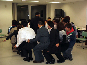 【?? 参加者全員で輪になり一斉に後ろの人の膝に座る受講生】
