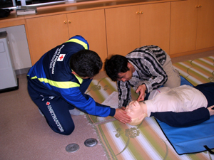 傷病者を発見した場合、まず『意識』、『呼吸』、『心臓』の状況を確認し、それぞれの場合における対処法について人形を使いながら指導して頂きました。