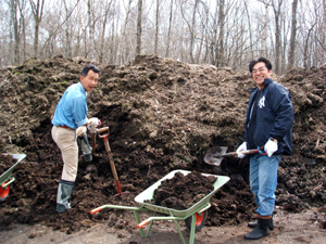 【堆肥場で堆肥を積む菅原さん(左)・安田さん(右)】