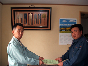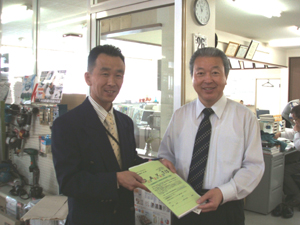 【菅原副組織委員長(左)と長江建材(株)の長江社長(右)】