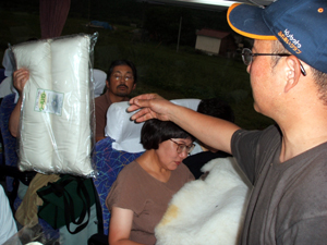 見学の途中から雨が降りだしました。酪恵舎のチーズ購入を目当てに参加した人がいることを知った従業員は、急遽次の目的地まで移動する車内でチーズの販売することになりました。「車内販売は初めてです。よい経験ができました」と完売したチーズの籠を手に、従業員も笑みを浮かべていました。
