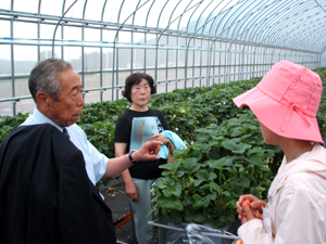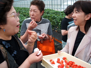 【真っ赤な乳呑ファームのイチゴを試食する参加者】