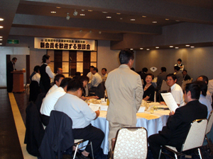 その後、(株)前田美粧の前田社長さんの楽しい司会のもと各テーブルをまわり新会員の紹介を行いました。
