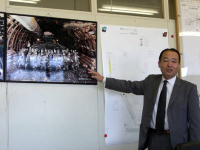 【採掘設備について説明する菊地さん】