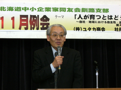 同友会釧路支部では11月17日のお昼に釧路支部昼食会、その後、白糠地区会11月例会を白糠町公民館で開催しました。白糠地区会11月例会では?螢罐織?商会の本郷社長(北海道同友会代表理事)が「人が育つとはどういうことか〜自社・地域における自主性・主体性を備えた社会人をどう育てるか〜」について講演しました。