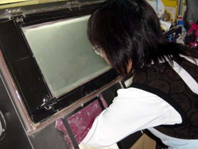 ガラス皿に貼った絵柄を専用カッターで切り取ります↓