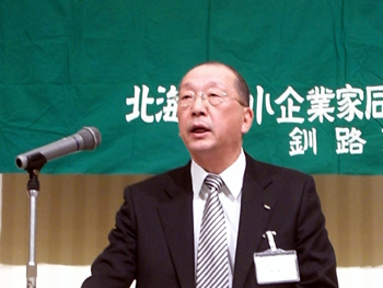 大勢の同友会釧路支部会員が集い、北海道同友会代表理事の(株)ダテハキの守氏が「靴業界におけるマーケットの変化」について講演しました。
