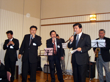 【「上を向いて歩こう」を歌う、伊東市長とノイズ倶楽部のメンバー】