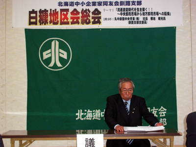 釧路支部白糠地区会(大畑幸男会長:19社)は4月6日に地区総会を開催し、2007年度の活動方針と役員を決めました。その後、横地敏光釧路支部長が「流通激変時代を生き抜く!〜中央卸売市場から地方卸売市場への転換〜」と題して記念講演に立ち、卸売市場の仕組みと現状を報告しました。