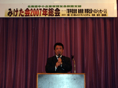 釧路支部みけた会は4月10日に2007年度の総会を開催し、新年度の役員体制と活動方針を決定しました。また、「若手経営者・後継者・幹部社員へのメッセージ」と題して(株)三ツ星レストランシステムの谷川富成社長が記念講演に立ち、自らの経験を元に新年度を迎えるみけた会にエールを送りました。