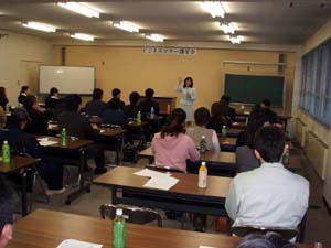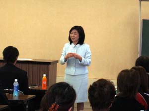 講師の小川睦子氏は、「人間関係を構築して行く上で大切なのは第一印象。その良し悪しで会社の評価が決まると言っても過言ではない。比率で言うと態度55%、発声38%、会話の内容7%です」と指摘しました。さらに、マナーで特に大切な心のこもった応対にふれ、「つくり笑いではなく、心からの笑顔と明るくあたたかい言葉づかいで応対し、好意と信頼を持っていただきましょう」と受講生に強く訴えました。