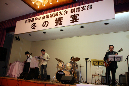 初めての試みとなるこの「冬の饗宴」は、釧路支部の会員の交流を図り、互いの業種の認識を深め、同友会で生まれた関係をより親密にするために企画されました。岩口潔企画委員長の挨拶とノイズ倶楽部の演奏でイベントがスタート。事前に出展商社から提供された食材をホテルのシェフが調理し、参加者に振舞われました。 鹿肉を使った料理や厚岸産の牡蠣など、食材を生かした料理に参加者は舌鼓を打っていました。会場には企業の出店ブースが設けられ、各社が趣向を凝らして主力商品をPR。各社の特色をより深く知ることができました。来場いただいた150名の方々はアサリのつかみ取り、ゲーム大会、参加企業から提供された商品のセリや抽選会などを楽しみ、当日の悪天候をものともしない熱い宴になりました!