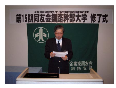 同友会釧路支部は14日に第15期同友会釧路幹部大学の修了式を開催しました。同支部は企業人として必要な経済、文化、文学、哲学、歴史などの学習を通じて幹部社員として不可欠な科学的なものの見方、考え方を見につけることを目的とした「幹部大学」を毎年開講しています。これまで14年の歴史を誇り、150人の修了生を輩出しています。