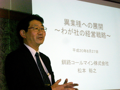 根室支部(福井富士雄支部長)は27日、『異業種への展開〜わが社の経営戦略』と題して例会を開き、釧路支部会員で釧路コールマインの松本裕之事業部長が講演しました。同社は石炭の生産・販売を主力とし、自動車の解体・リサイクル・中古部品販売を手掛ける釧路オートリサイクルや粗大ゴミ処理センターの運営など次々に新規事業分野を開拓しています。