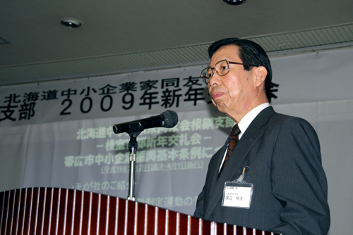 根室支部(福井富士雄支部長)は27日に2009年の新年交礼会を開き、新春を祝しました。また「元気な企業、地域をつくろう」と題して帯広支部副幹事長で、帯広市中小企業振興協議会会長の渡辺純夫氏が新春記念講演に立ちました。