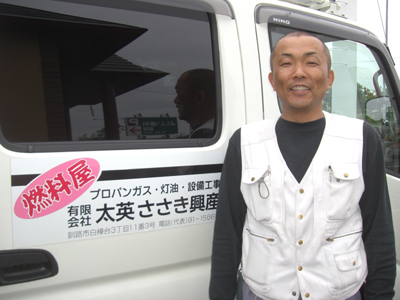 ご無沙汰しておりました。昼寝が長かった黒介でおました。本日は「THE燃料屋」太英ささき興産の佐々木太社長にガスの配達中ですが突撃インタビューを試みました。現場に到着した黒介に佐々木社長はいきなり「おつかれさまです!!佐々木でございます!」。威勢の良い大きな声で迎えてくれました。「プロパンガス、灯油・軽油・重油の販売はもちろん、ガス・プロパン・灯油設備の販売・設計・施工が取扱品目です。ガスや灯油で困ったときにはご一報ください!!これから飲食店等やられる方は厨房工事等何かございましたらご相談ください。こう見えても私エネルギーアドバイザーですから!!」安心・親切・頼りになりますね!ところで社長、情報によると、かなりのお酒好きでカラオケもお上手だとお聞きしましたが?「どこから聞いたとっすか? いや〜お酒もカラオケも好きですね。特に最近はハイボールにハマッテます。何かお酒の話をしてたら、飲みに行きたくなりましたね。これから飲みますか?黒介さん! 飲まないとやってられんでしょう!」「・・・・・」(黒介)。とても元気で、活動的な佐々木社長でした。でも、頭に鉢巻の方が似合うかも・・。【取材:真っ黒黒介】