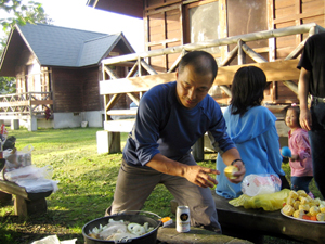 幹部大学同窓会幹事が中心となって取り組んできた、幹部大学イモの栽培。当日は、森川・米木さんが朝から山花リフレの市民農園でイモを収穫し、このイモを使った料理を2日前から準備を行ってきた森川さんが調理し参加者に振舞いました。特にダッチオーブンの使った鳥の丸焼きは絶品でした!!