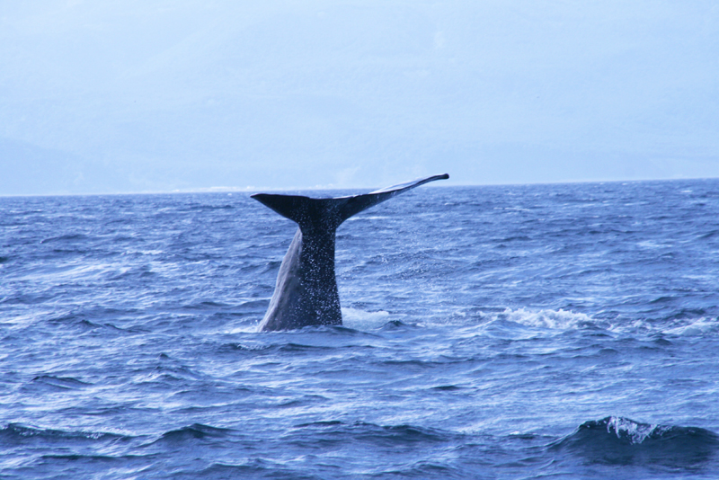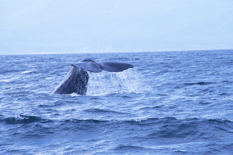 当日は2時間かけてクジラを追いかけ、クナシリ沖10キロの海域でマッコウクジラに遭遇しました。体長15メートル。大きく息を吸い込み、大型バス並みの巨体をくねらせ深海へと潜っていきました。