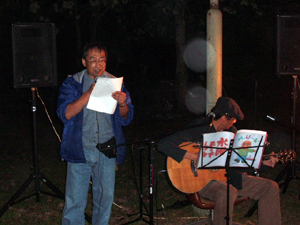 【浅野さんの演奏のもと、歌を歌う大道さん】