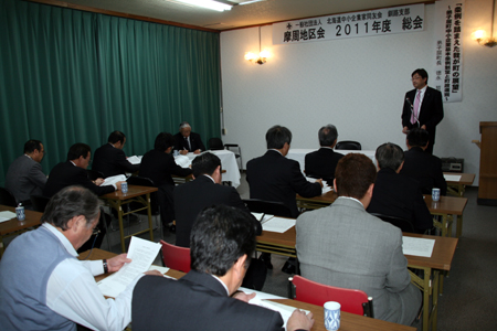摩周地区会(竹森英彦会長)は8日、2011年度の地区総会を開催しました。冒頭、挨拶した竹森会長は4月1日に施行された弟子屈町中小企業基本条例に触れ、「この条例は『育てていく条例』だ。条例を活用してどのような具体的施策を展開していくかが重要になる。2011年度は役場、商工会の皆さんの協力を得て、中身のある、しっかりした議論を行っていきたい」と述べました。