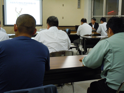 曽我部氏は「3年前から東京農業大学で始まったエゾシカについて学ぶ『エゾシカ学』が注目されている。エゾシカの生態や処理方法、食肉加工から販売、経営といった総合的な学問を学ぶことができるため、受講する学生も増加している」とし、栄養学などの分野でも注目されているエゾシカ肉について紹介しました。また、「鹿肉はヨーロッパでは『ジビエ』という高級食材で提供されている。国内でも大手外食チェーンなどとのタイアップ商品が登場し、食材としての価値が認められてきている」と鹿肉の需要が拡大している背景について説明しました。