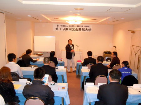 釧路支部(亀岡孝支部長)は13日、第19期幹部大学をスタートしました。これまで270名余りの卒業生を輩出し、釧路地域の経済を支える人材を育成する企画として定着してきたのが幹部大学です。今期は16名の受講生が互いに学びあい、成長するため参加しました。冒頭、挨拶した共育求人委員長の矢部政仁氏は「昨年は東日本大震災があり、人と人とのつながり合いが非常に重視された一年だった。幹部大学では自分自身の向上だけでなく、他者とのつながりを築くのにも良い機会だ。互いに切磋琢磨して高めあってほしい」と期待を寄せました。